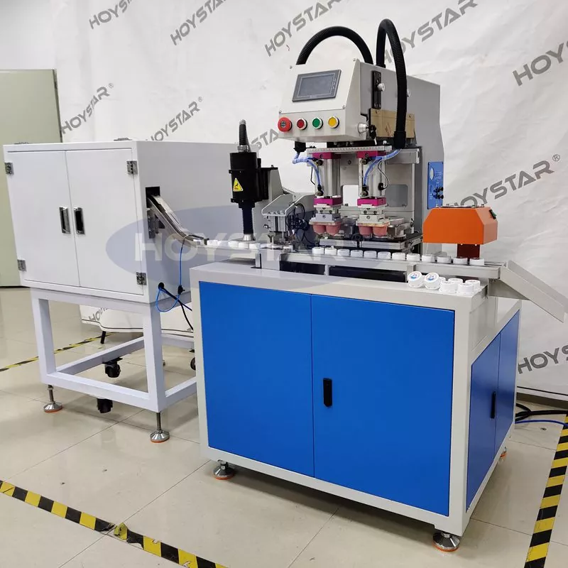 Máy in Pad nắp chai 2 màu được xử lý bằng plasma được trang bị bộ nạp rung tự động có thể thực hiện tải tự động mà không cần thao tác thủ công, tiết kiệm nhân lực