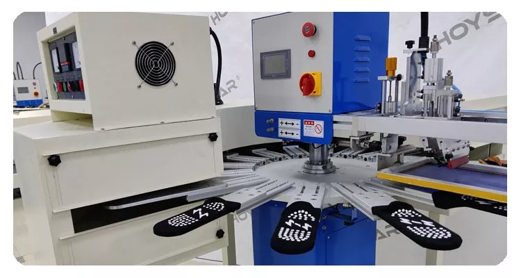 Là nhà sản xuất và nhà cung cấp chuyên nghiệp, Máy in lụa vớ cỡ lớn nhanh HOYSTAR này được thiết kế cho các ứng dụng trong ngành dệt kim. Với tốc độ lên tới 1200 CÁI / Hr, nó phù hợp để in tất chống trượt, tất trẻ em, tất người lớn, tất bóng đá, v.v. Được trang bị bàn làm việc quay và 16 trạm làm việc, rất thuận tiện cho việc bốc dỡ tất. Điều khiển màn hình cảm ứng PLC, rất dễ vận hành. Máy được trang bị hệ thống sấy có thể làm khô silicon và mực in tốt.