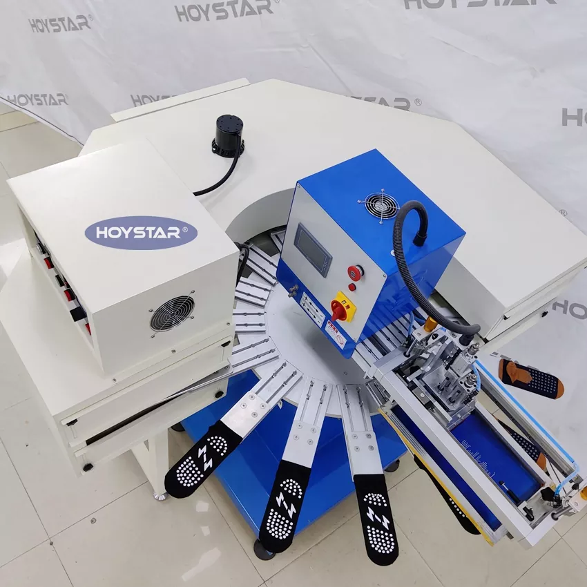 Là nhà sản xuất chuyên nghiệp tại Trung Quốc, chúng tôi muốn cung cấp cho bạn Máy in lụa tất cỡ lớn HOYSTAR tốc độ cao. Điều này đi kèm với 16 máy trạm phù hợp cho sản xuất khối lượng lớn. Nó có tính năng PLC tiên tiến và điều khiển màn hình cảm ứng có thể in đế và gót tất. Một đường hầm sấy IR tích hợp đảm bảo sấy silicon và mực hiệu quả